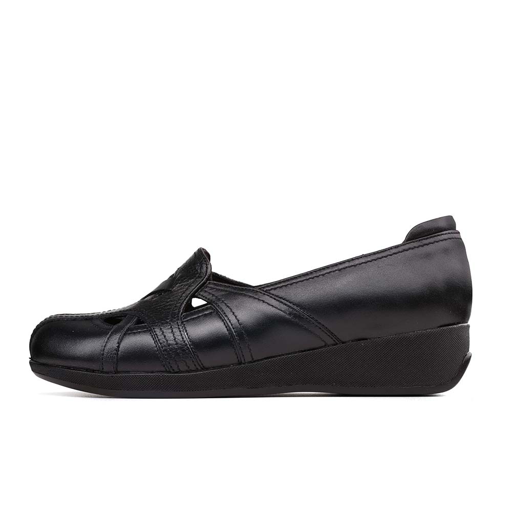 مدل 01-10025 از سری کفشهای تابستانه روشن با رویه چرم طبیعی مشکی رنگ میباشد. رویه چرم به همراه پنجه پهن، میزان فشار به سطح رویی و انگشتان پا را کاسته و از روی هم افتادگی انگشتان و ایجاد تاول در بین آنها جلوگیری مینماید..